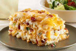 Mashed potatoes combine with cream cheese, scallions, bacon and Cheddar before layering with lasagna noodles to make this easy, hearty casserole.