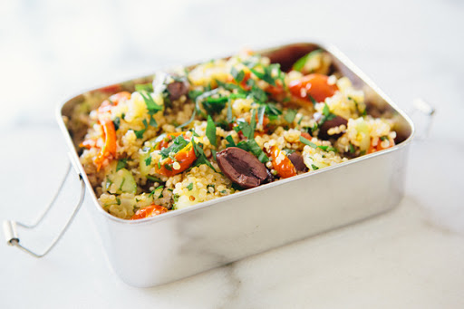 In a large mixing bowl combine tomatoes, quinoa, cucumber, kalamata olives and chimichurri.