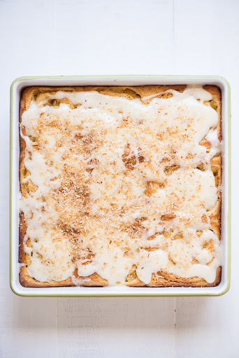 Using a stand or hand mixer mix together the icing ingredients until well combined. Drizzle over the top of the rolls and sprinkle toasted coconut over the top. Serve warm