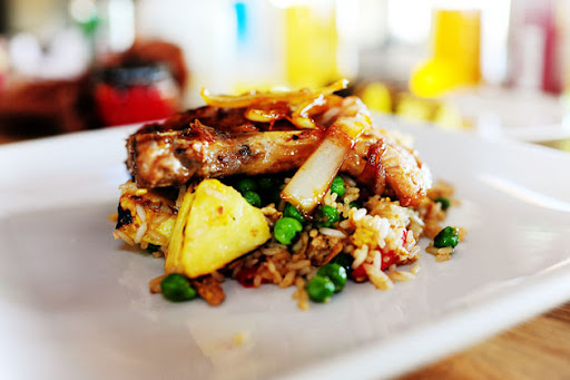 To serve, pile rice on a plate, then top with a pork chops and onions from the sauce. Drizzle a little bit of sauce over the top.