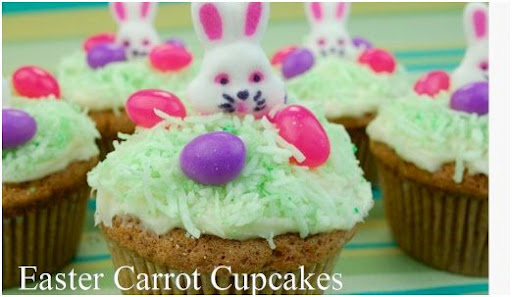Remove from the oven and let cool completely on a wire rack. With a knife or small metal spatula spread cream cheese frosting on top of each cupcake. Garnish with the green colored coconut and Easter candy. Cover and refrigerate the cupcakes until serving time.
