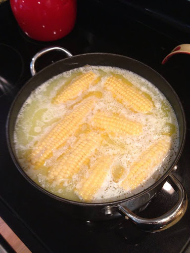 - Fill pot with water then add a stick of salted butter and 1 cup of milk. Bring to a rapid boil. Put ears of corn in turn heat to low simmer for 5-8 minutes It will be the best corn on the cob you have ever had !!!