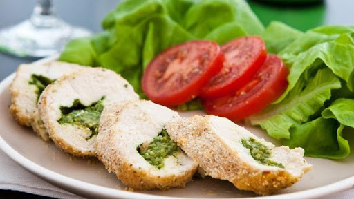 4 Spread 1/4 cup Homemade Pesto onto each chicken breast; top each with 1 slice mozzarella cheese. Wrap chicken around cheese; secure with toothpicks.