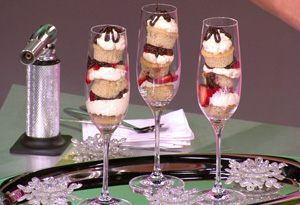 Line up 12 glass Champagne flutes. Insert 1 mini strawberry Champagne cupcake in the bottom of each glass. Next, pipe a swirl of Champagne buttercream frosting on top of each cupcake. Add several slices of Champagne-soaked strawberries and a drizzle of chocolate. Repeat layers. Finally, place a third mini strawberry Champagne cupcake at the top of each glass, pipe with a final "Georgetown Cupcake signature swirl" of Champagne buttercream frosting, and top with a final drizzle of melted chocolate.