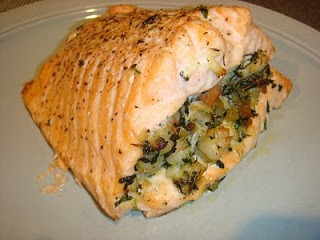Cut slits in sides of thickest part of the salmon pieces and place on an aluminum wrapped baking sheet. Stuff with the seafood mixture.