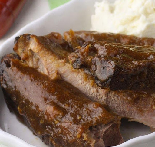 Slice ribs into serving-size pieces and place in a slow cooker. Top with onion, drizzle sauce mixture over all. Cover and cook on low setting for 8 hours.