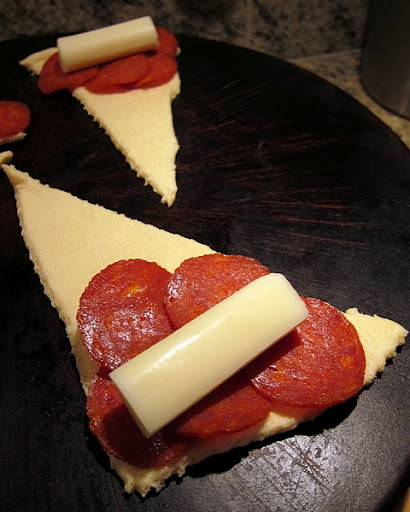 Unroll crescent rolls and separate into 8 triangles. Place 5 slices of turkey pepperoni on each crescent roll. Top pepperoni with string cheese half and roll up. Sprinkle crescent rolls with garlic powder. Place rolls on baking sheet and bake for 12-15 minutes, or until golden brown. Serve with a side of warm pizza sauce