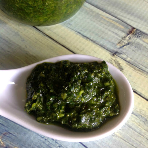 Basil Pesto that is dairy, nut, and seed free. Great with a veggie pasta, served with fish, or poultry.