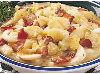 Boil potatoes in skins until done; peel and dice. Add celery, boiled eggs, onion and parsley. Set aside. Fry bacon in heavy fry pan; drain all but 3-4 tablespoons of bacon fat. Add sugar, vinegar, water, eggs, mustard, salt and pepper. Simmer about 10 minutes or until mixture thickens. Remove from heat and immediately pour bacon mixture over potatoes. Mix lightly. Serve warm.
