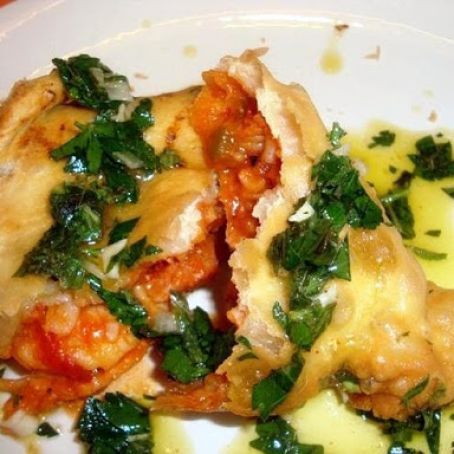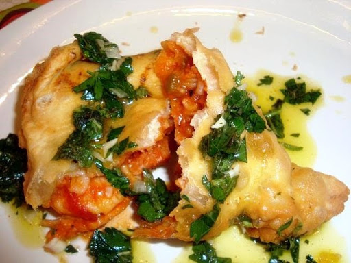 Golden-brown samosas stuffed with a rich, savory mixture of bacon and tomato-infused rice studded with ham and shrimp, drizzled with a garlicky lemon-mint sauce