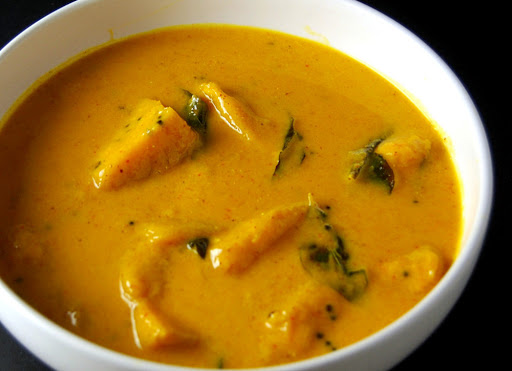 Add the mangoes and the ground coconut milk paste. Add a cup of water and stir the jaggery or sugar. Add salt to taste.