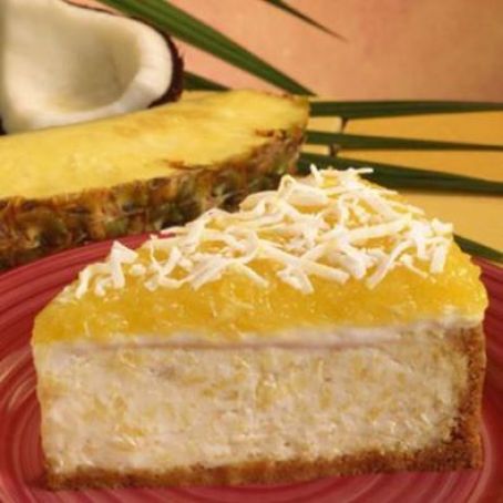 When the cheesecake has cooled, spread the pineapple topping over the top and sprinkle on the shredded coconut flakes.
