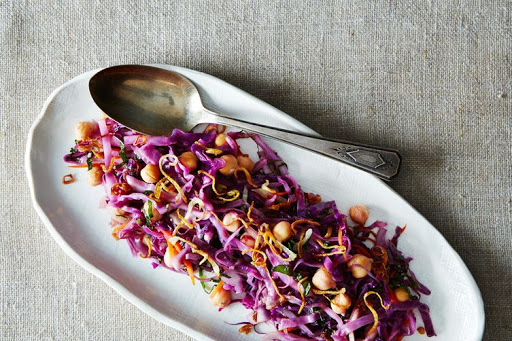 Preheat the oven to 250° F. In a bowl, mix chickpeas with 1 1/2 teaspoons olive oil, then add the salt, za’atar, black pepper, lemon juice, and zest. Bake for 10 to 15 minutes. Set aside. Pour the canola oil into a deep-sided pan and heat it to 350° F. Fry the shallots until red and crunchy, then transfer them to a paper towel to drain. Heat 1 teaspoon olive oil in a sauté pan over high heat. Add in the garlic, stir, then add the carrot, fennel, and red cabbage. Cook for 5 minutes. Remove pan from the heat and add the roasted chickpeas, mint, raisins, and maple syrup. Mix well. Add feta cheese, if desired. Taste and add more vinegar, lemon, or salt if needed. Garnish with fried shallots.