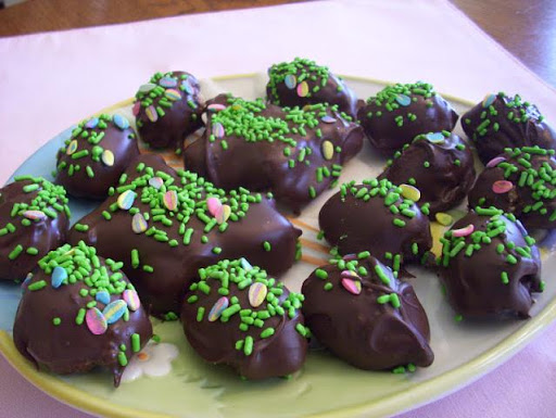 In a large bowl cream butter. Gradually add the confectioners sugar, graham cracker crumbs, peanut butter and vanilla. Add half and half or milk if necessary to get mixture to right consistency. Shape into small eggs. Place on waved paper baking sheets. I used molds I had but you can shape into egg shape with your hands. Refrigerate for 30 minutes or until firm.