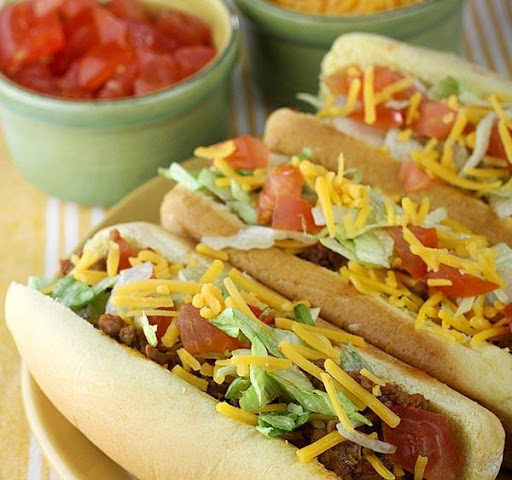 - Garnish: shredded Cheddar cheese, shredded lettuce, chopped tomatoes, sour cream