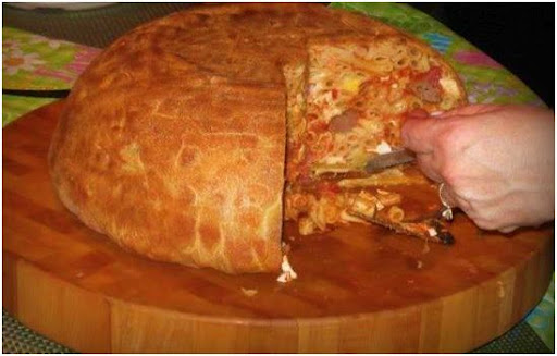 Bake in a 350 degree oven until lightly browned, about 1 hour. Then cover it with aluminum foil and continue baking until the timpano is cooked through and the dough is golden brown about 45 minutes. It should reach an internal temperature of 120 degrees. Remove from the oven and let it rest for at least 30 minutes. Have an appropriate platter ready, set it upside-down over the timpano, grab the timpano and platter together and flip it over. (Do not take the pan off yet, let it rest like this for 30 minutes.)