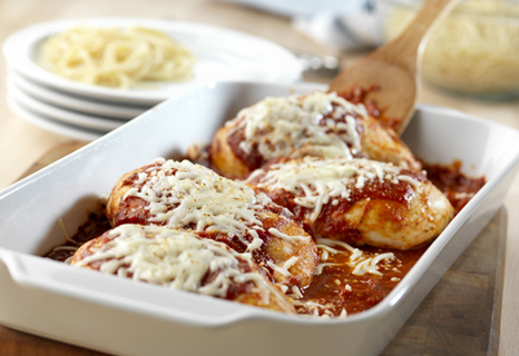 Bake at 400°F. for 25 minutes or until the chicken is cooked through. Serve the chicken and sauce with the spaghetti.