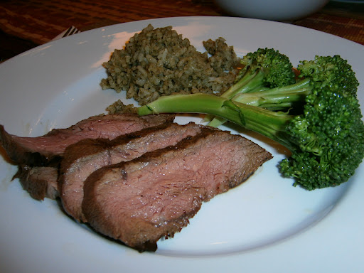 Carve on the bias, thin slices, and serve with Rice(?) and Vegetable