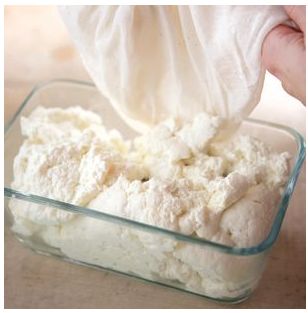 Gather the cheesecloth by its corners and twist together to force out the liquid. When the liquid turns from clear to milky and the cheese starts to push through the cheesecloth, it has drained enough.