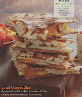 Lay 4 tortillas on a flat work surface and sprinkle each with 2 Tbs. cheese. Divide chicken and apple slices evenly among the tortillas. Sprinkle each with remaining cheese. Top with remaining tortillas.