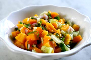 Combine the mango, cucumber, jalapeno, red onion, lime juice and cilantro leaves and mix well. Season with salt and pepper, to taste.
