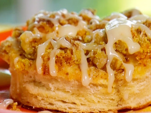 Meanwhile, in a small bowl combine confectioners' sugar, cream cheese, and orange juice. Blend until smooth adding more orange juice, if needed, to thin. Drizzle glaze over the warm coffee cake and serve.