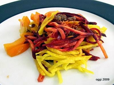 Put the vegetables and raisins in separate piles in one container. Mix the rice vinegar, sugar, and salt and stir until sugar is melted. Pour all over the vegetables. Chill for at least 1 hour. Toss gently and transfer into a serving plate.