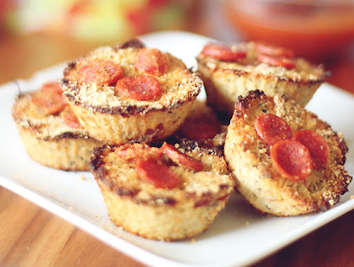 Place muffin tin in the oven and bake muffins for 30-35 minutes, or when top starts to become golden brown. Remove from the oven, let cool completely before popping the muffins out of the liners. Serve warm with pizza sauce for dipping! *(This step is meant to break down the cottage cheese in the microwave. You could skip this step, and put everything back into the the food processor until the cottage cheese is smooth.)