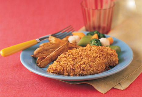 Dip the chicken into the broth. Coat with the corn flake mixture. Place the chicken onto a baking sheet.