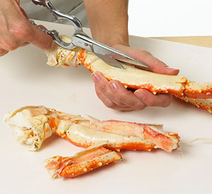 Note: If split crab legs are unavailable from your grocer, purchase whole legs. Using kitchen shears, cut through the lighter colored underside of each leg. Lay partially split legs on a cutting board. Cut through each hard shell with a sharp knife, completely splitting the legs.