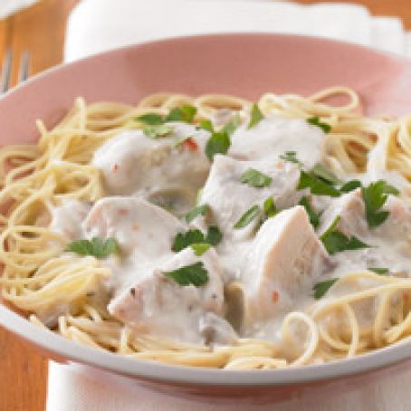 COOKpasta as directed on package, omitting salt; drain. Serve topped with chicken mixture; sprinkle with parsley.
