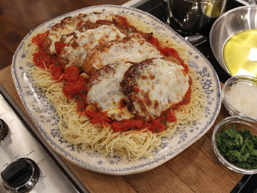 Pour the tomato sauce around the chicken in the baking dish. Sprinkle the mozzarella and Parmigiano cheeses over the chicken. Bake until the cheese melts, about 8 minutes.