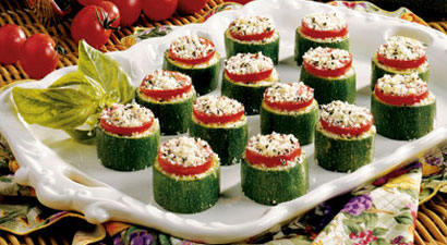 Cut zucchini into 3/4-inch slices. Using a melon baller or small spoon, scoop out the insides and discard, leaving the bottom intact. Place zucchini on an ungreased baking sheet; spoon 1/2teaspoon crumbled blue cheese into each.
