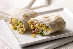 SPREAD tortillas with remaining cooking creme; top with egg mixture. Fold in opposite sides of each tortilla, then roll up, burrito-style.