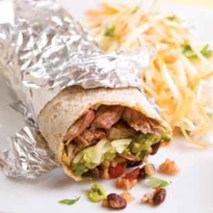 Here’s a burrito inspired by San Francisco’s super burritos that come packed with meat, beans, rice, cheese, guacamole and salsa. We’ve kept this home-style version a bit simpler to make and a whole lot healthier with brown rice, whole-wheat tortillas and a more reasonable serving size. We recommend wrapping it in foil—the traditional way to serve it—so you can pick the burrito up and eat it without it falling apart, peeling back the foil as you go. Serve with a cold beer and vinegar-dressed slaw.