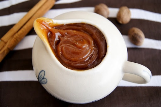Once you've achieved the dark color, reduce the heat to low and carefully whisk in the butter, cream, and crème fraîche. Stand back! When you add these ingredients, the mixture will likely hiss and bubble up. Continue to whisk until it's smooth. Then add the salt, cinnamon, cardamom and nutmeg. Stir to blend, and remove from the heat.
