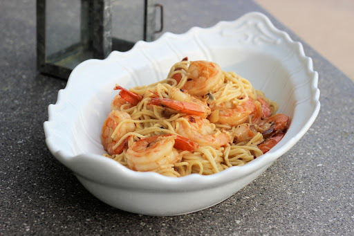 SIMPLE GARLIC OIL & CRUSHED RED PEPPER CAPELLINI WITH GRILLED SHRIMP