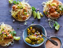 To serve, set up the tacos "family-style". Assemble the fish in a pile on a plate; the pink chile mayonnaise in a bowl; and mango-radish salsa in another. Set a pile of shredded savoy cabbage, cilantro leaves, chopped chives and lime wedges next to the fish. Toast the corn tortillas lightly over an open flame (on your stove top) and serve.