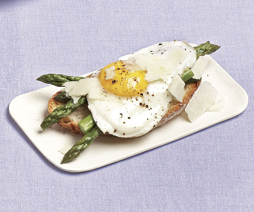 Meanwhile, crack the eggs into a shallow bowl. When the asparagus is ready, pat dry and divide it among the pieces of toast. Wipe out the skillet with paper towels if wet; then slide the eggs into the hot skillet, sprinkle each with a pinch of salt and pepper, cover, and cook over low heat until the whites are firm but the yolks are still runny, about 2 minutes.