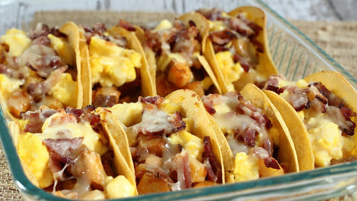 In ungreased 13x9-inch (3-quart) glass baking dish, place tortillas standing against each other to form taco shells.