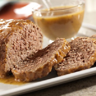 Heat the oven to 350 degrees F. Thoroughly mix the beef, bread crumbs and egg in a large bowl. Place the beef mixture into a shallow 3-quart baking pan and shape firmly into an 8x4-inch loaf.