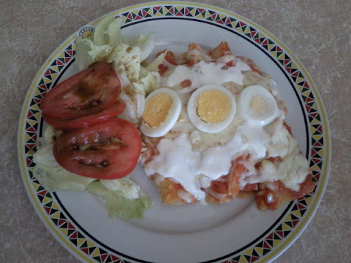 Las tortillas las vamos a freír en aceite solamente unos 30 segundos por cada lado, las colocamos en un plato y hacemos las enchiladas con el pollo ,montamos el platillo que bañamos con la salsa bien caliente y luego con la crema, se espolvorea con el queso y se adorna con rodajas de huevo cocido y cebolla.