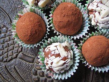 Place the cream in a saucepan and heat until boiling. Break the plain chocolate pieces into a bowl. Pour the hot cream onto the chocolate, add the alcohol, stir until the chocolate has melted then beat with an electric whisk until the mixture is cold and stiff (approx. 8-10 mins). Chill for 1 hour or until firm enough to shape. Shape about 25 truffles with a melon baller or teaspoon. Roll half in the cocoa and half in the crumbled flaked chocolate.