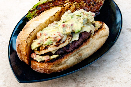 As the name implies, here's my version of a California burger. It's a half-pound burger on a rustic roll, topped with melted pepper-jack cheese, grilled onion slices, and lots of chunky funky guacamole.