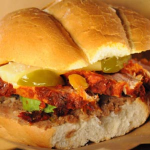 Coloca el lomo en una rejilla de horno y hornea a 190°C por aproximadamente una hora o hasta que esté bien cocida. Corta en rebanadas, parte el pan por la mitad, unta con frijoles, coloca rebanadas de aguacate, rebanadas de lomo, rebanadas de queso, jitomate, cebolla , lechuga y un chorrito de aceite de oliva y sal.