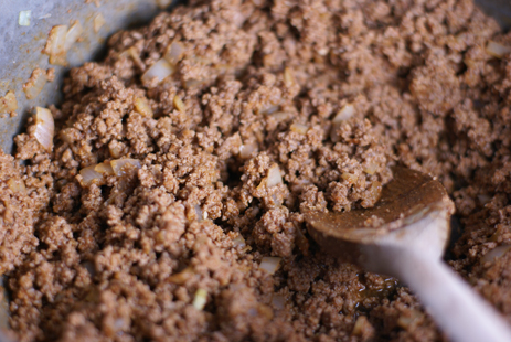 Add the tomato sauce and spices to the ground beef and let simmer over low heat for 10 minutes.