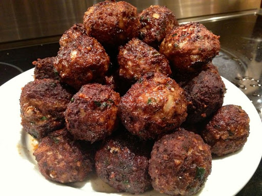 Form the meatballs into 7 to 8-ounce portions, just bigger than a baseball but not as big as a softball, and put them into a 2-inch deep baking pan. Be sure the sides do not touch to ensure even cooking. Bake until the meatballs reach an internal temperature of 165 degrees F on an instant-read thermometer, about 1 hour to 1 hour and 10 minutes. Transfer the meatballs to a serving platter and serve.