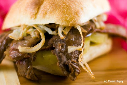 Place flank steak and teriyaki sauce (reserving 1/2 cup of sauce) in a large resealable plastic bag. Seal and allow to marinate overnight. Heat 1 tablespoon of the canola oil in a grill pan or sauté pan over medium-high heat. Cook steak in batches, discarding marinade, about 2 minutes per side until cooked through. Set aside and keep warm. Combine flour and salt in a medium bowl. Dredge onions in the flour mixture to coat. Heat remaining 1/2 cup of canola oil in a sauté pan over medium-high heat. Fry onions in batches for about 4-5 minutes until golden. Carefully remove with a slotted spoon or spatula and drain on a paper towel-covered plate. Lightly toast ciabatta halves in an oven or toaster oven. Spread a thin layer of reserved teriyaki sauce on the inside of each piece of bread. On each bottom ciabatta half, layer on two slices of pineapple, 1/4 of the teriyaki beef and 1/4 of the onions. Close each sandwich with the top ciabatta halves, serve and enjoy!