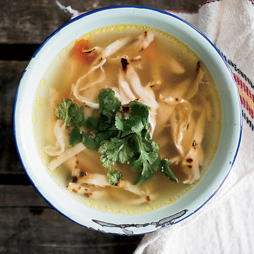 Transfer the chicken to a plate and let cool slightly. Shred the meat; discard the skin and bones. Return the chicken to the saucepan and reheat the soup. Stir in the lime juice and season with salt and pepper. Ladle the soup into bowls. Garnish with the tortilla strips and cilantro and serve.