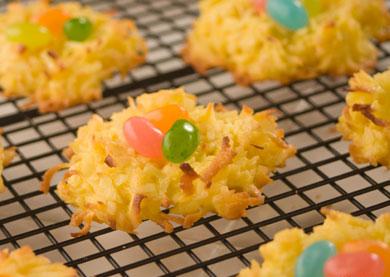 Bake 10 to 12 minutes, or until edges are golden. Remove from oven and gently push 2 jelly beans into each nest. Let nests cool slightly on baking sheets then remove to wire racks to cool completely. Store in airtight containers.